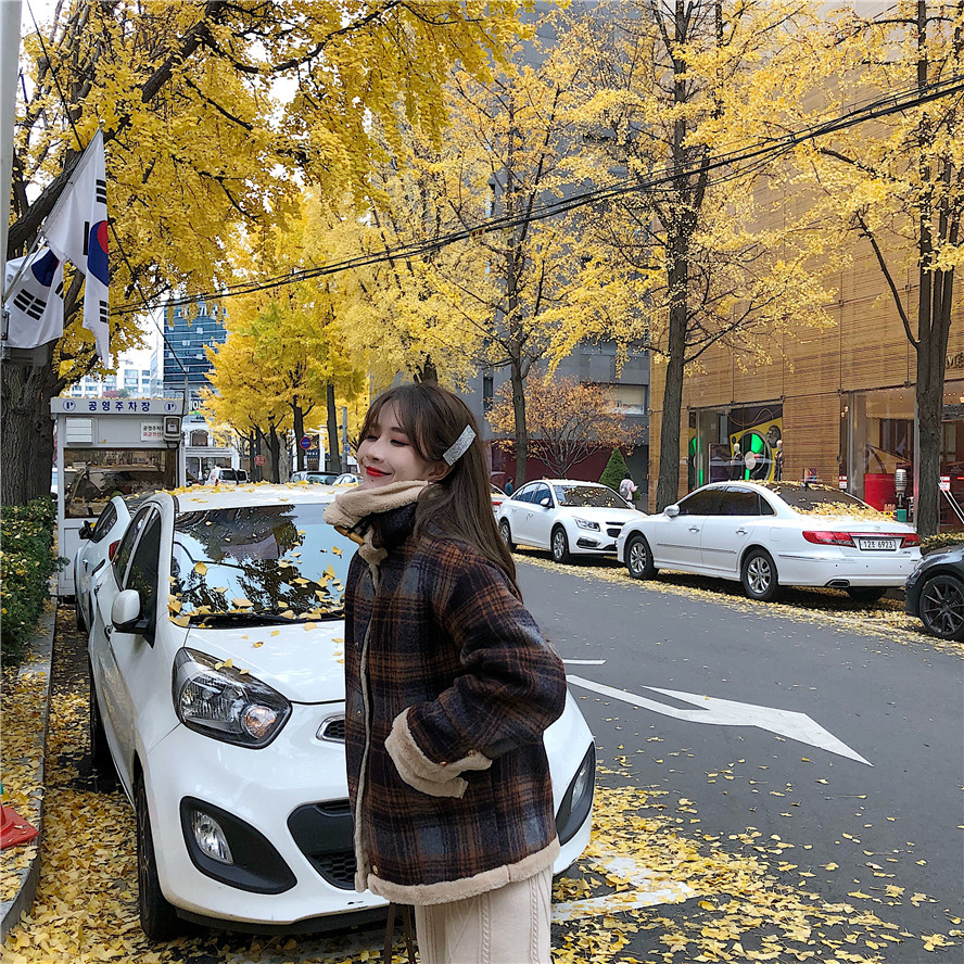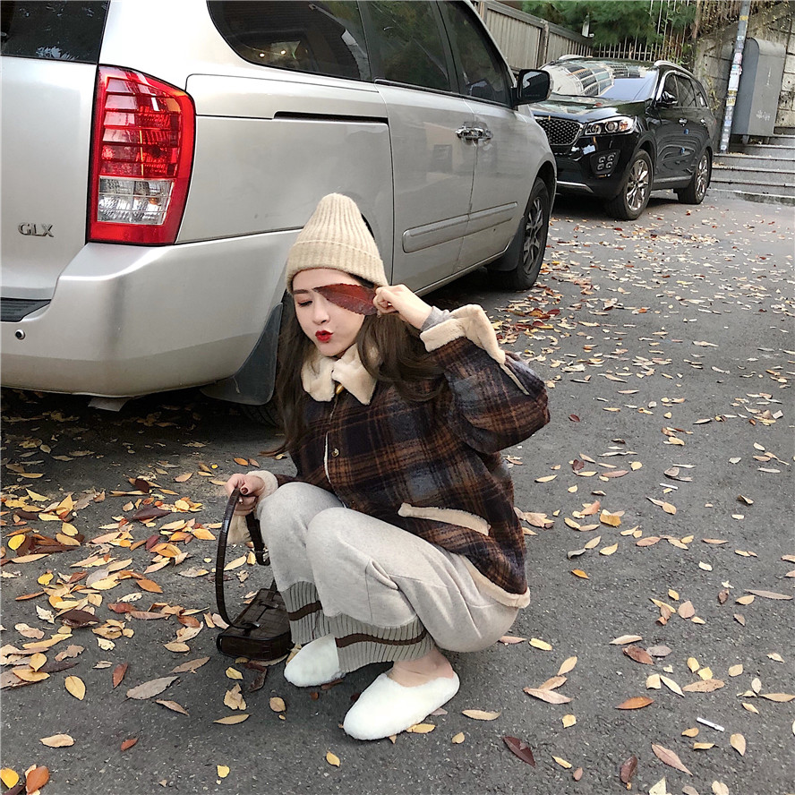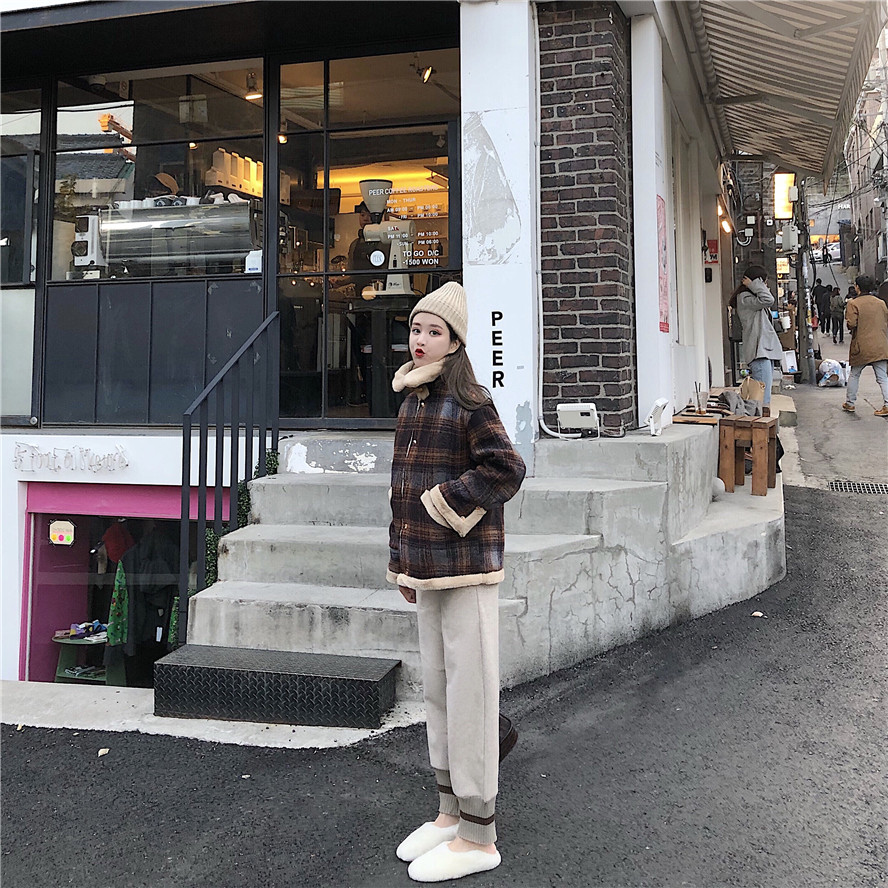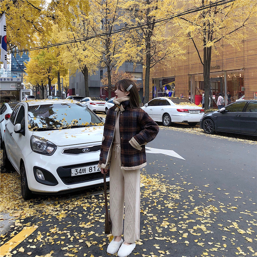 溫柔杏色打底|麻花針織褲|格子外套