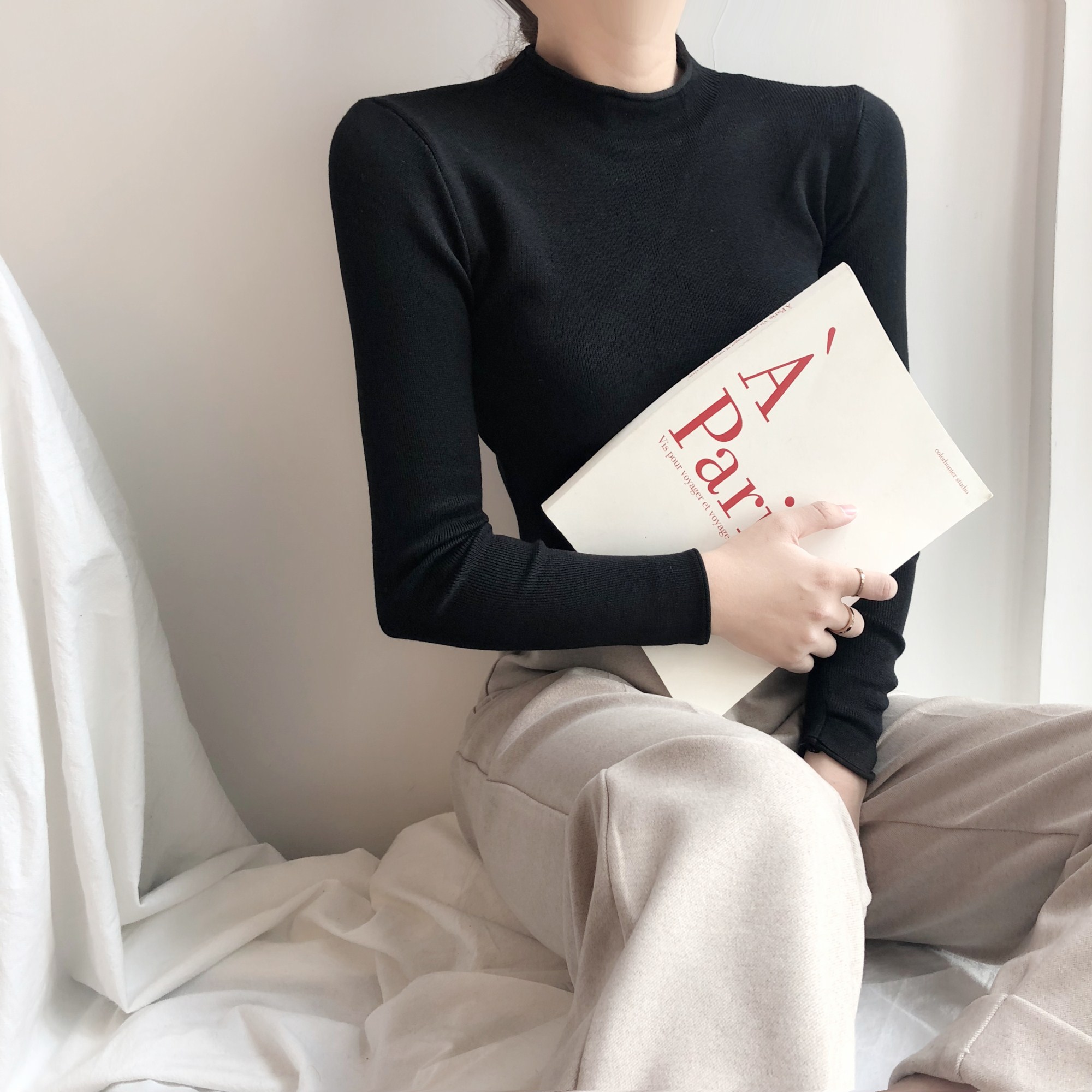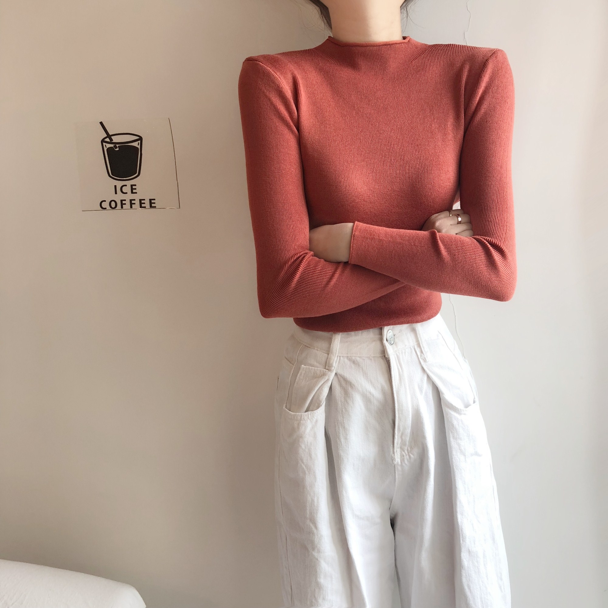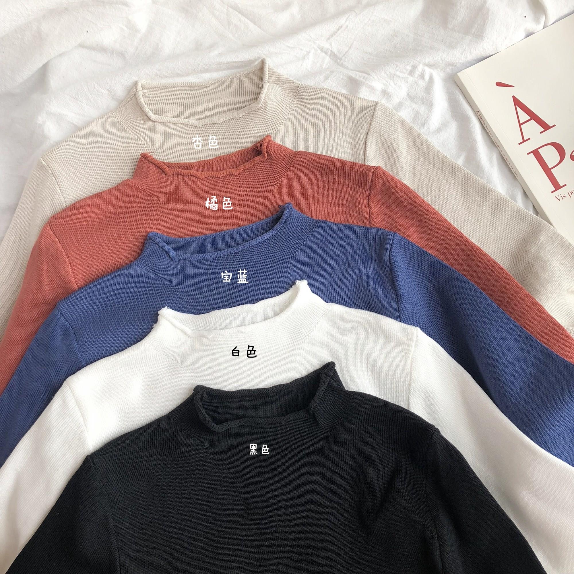 韓版秋冬半高領上衣百搭純色套頭時尚chic卷邊長袖針織打底衫毛衣