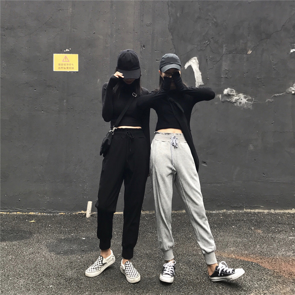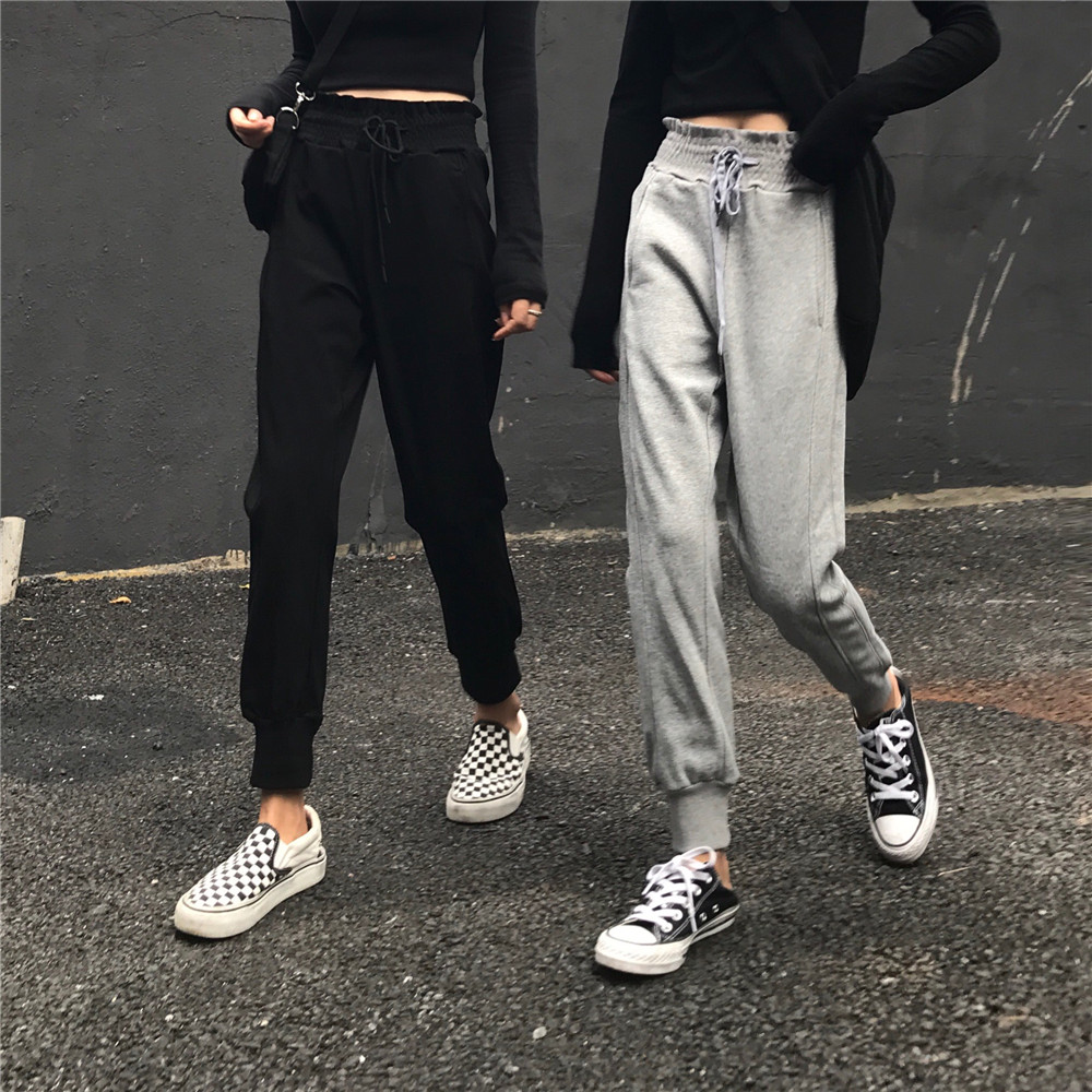 褲子女秋冬季新款復古百搭高腰顯瘦小腳九分褲哈倫褲系帶休閑衛褲