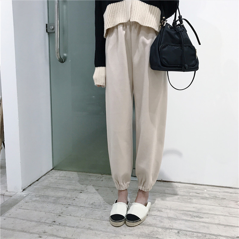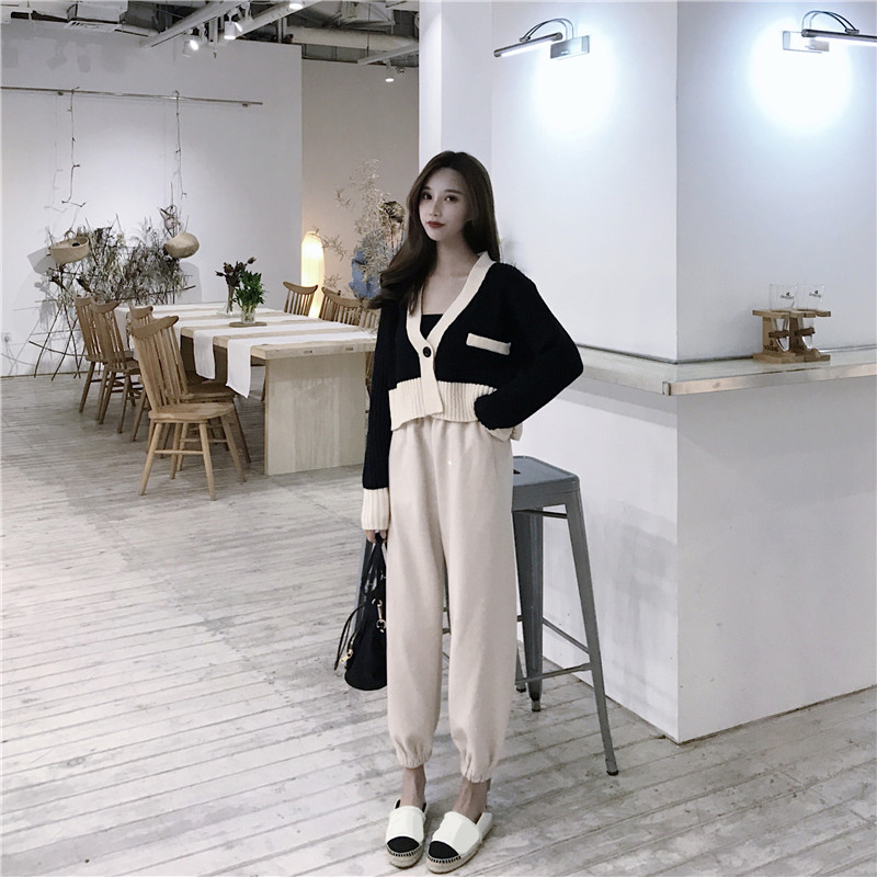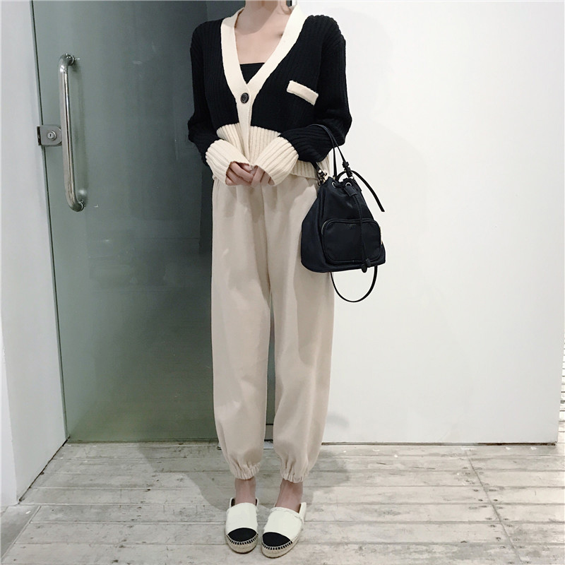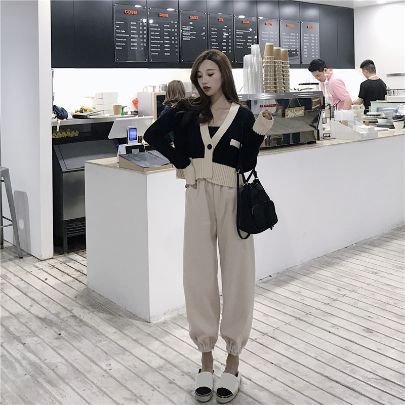 / 新款拼色短款V領開衫針織外套休閑高腰毛呢束腳哈倫蘿卜褲兩件套