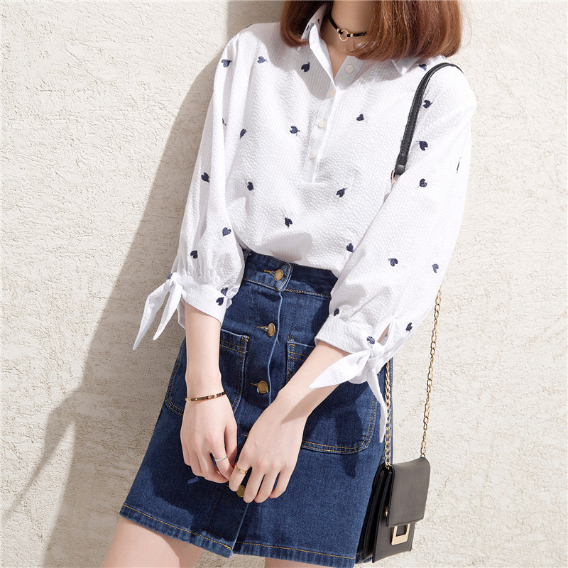 港味條紋襯衫女甜美上衣小清新韓范chic寬松白襯衣女夏裝新款