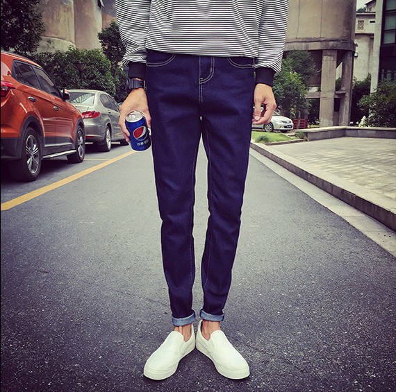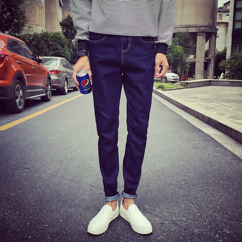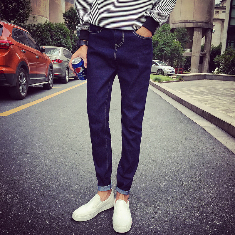 原創韓版修身瘦腿深藍色小直筒男士小腳牛仔褲