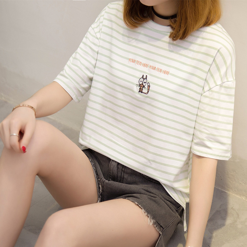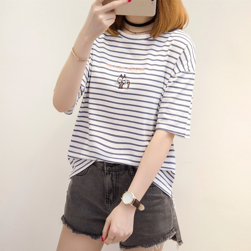 / 夏裝新款女小清新上衣條紋t恤女夏寬松刺繡體恤衫短袖衣服女