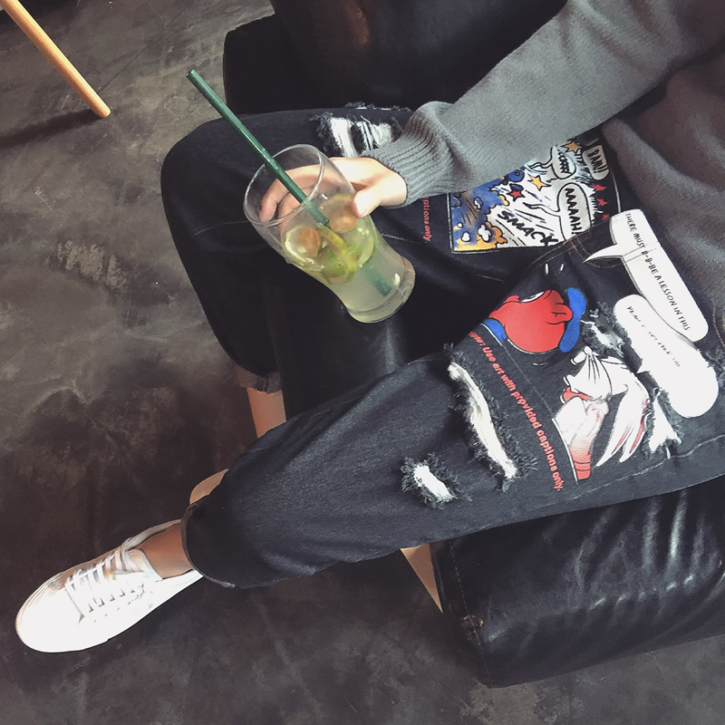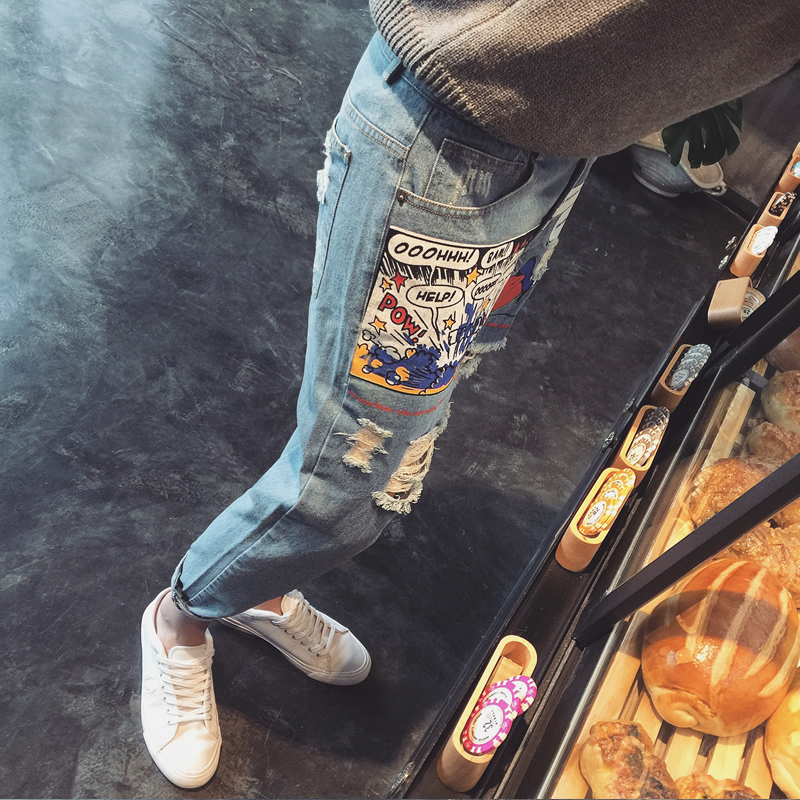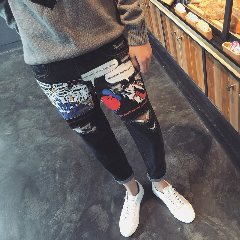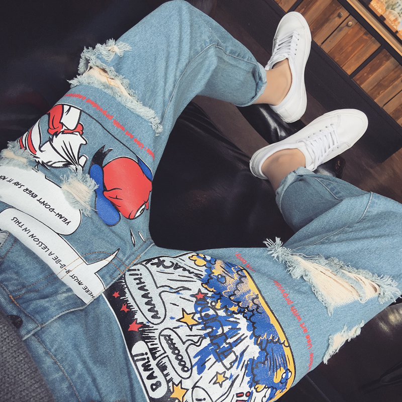 / 韓版學生百搭長褲卡通印花寬松破洞牛仔褲男哈倫褲