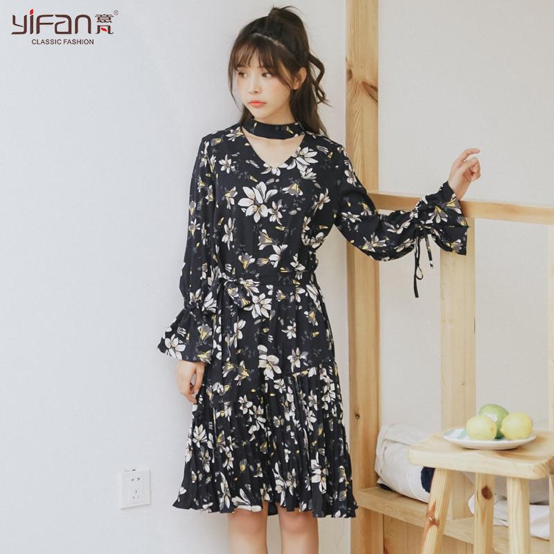 / 荷葉袖碎花連衣裙女裝寬松大碼雪紡長裙搭配中長款毛衣背心兩件套