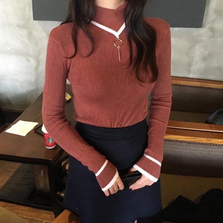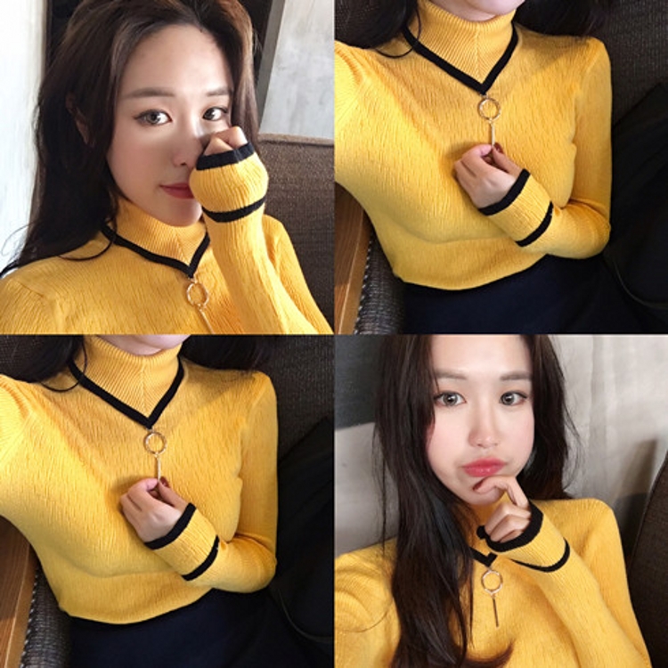 / 韓國chic秋冬款高領環扣螺紋拼色彈力緊身套頭針織衫打底衫女