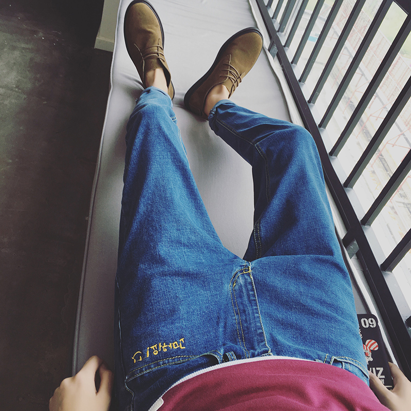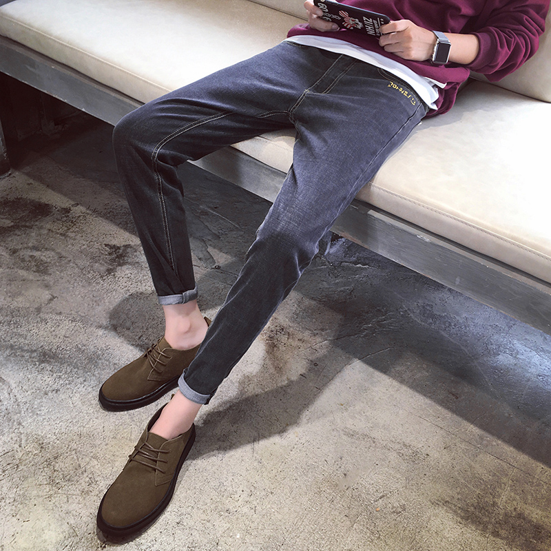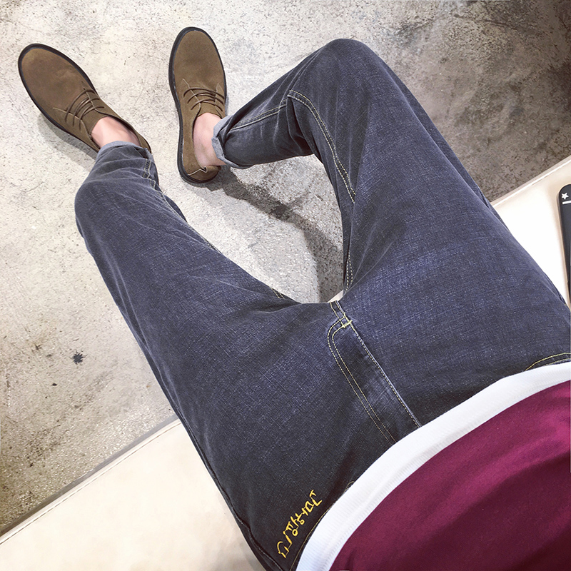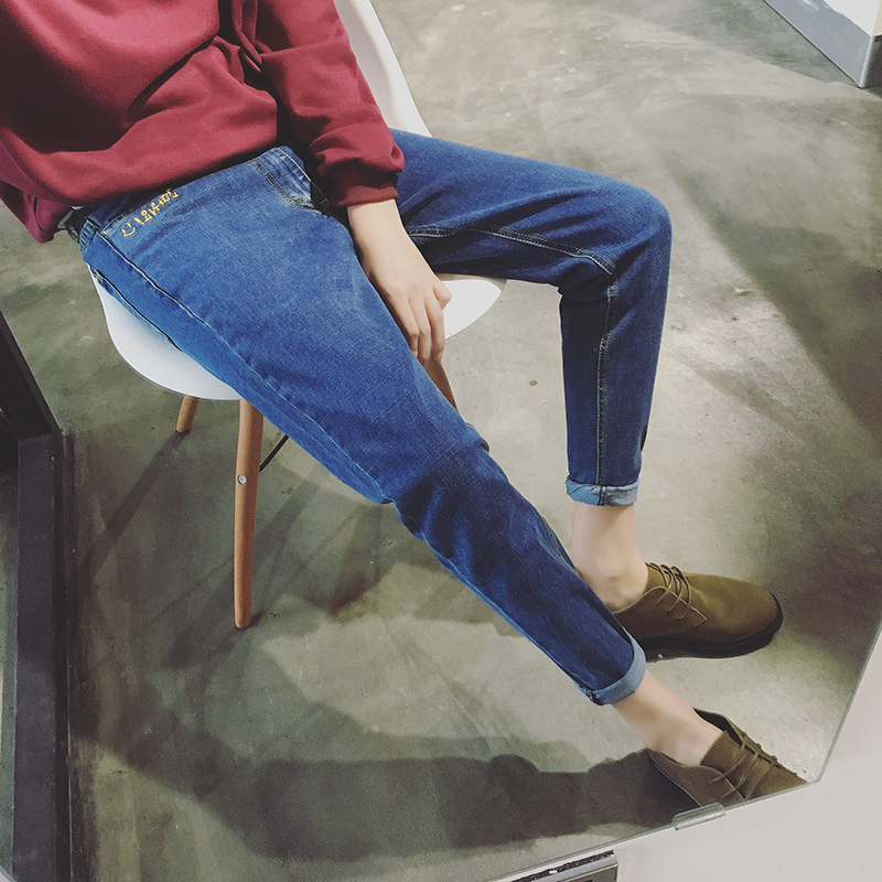 秋冬新款韓版小字母刺繡修身小直腳男士錐形牛仔褲