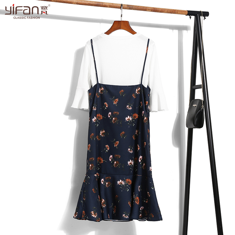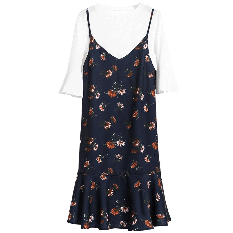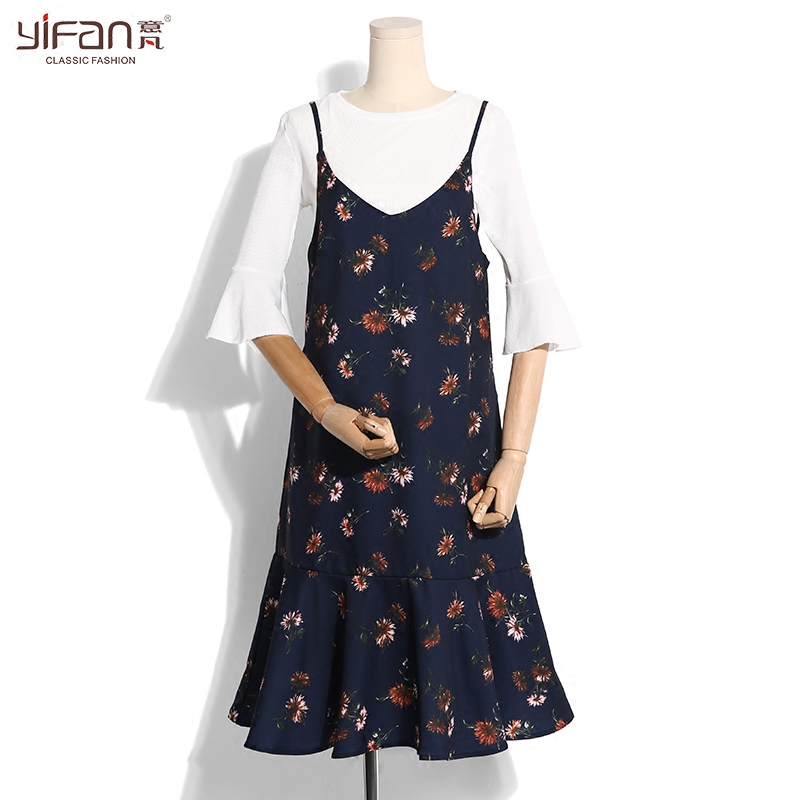 / 春夏新款韓版中長款時尚V領吊帶裙氣質碎花雪紡魚尾裙連衣裙