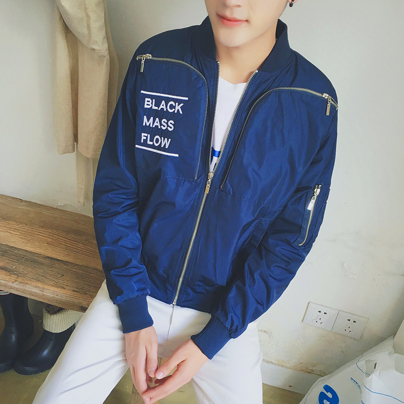 原創拉鏈口袋字母繡花潮男修身夾克韓版港風外套春