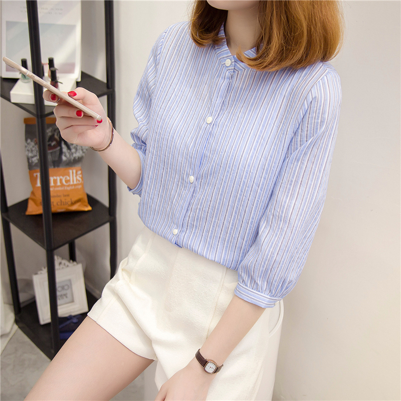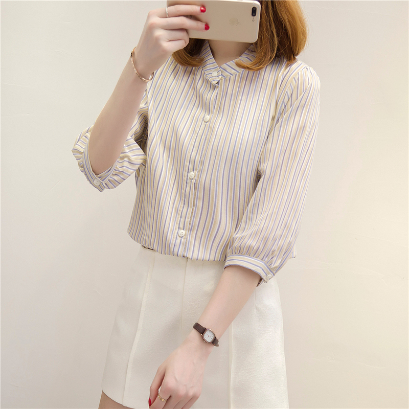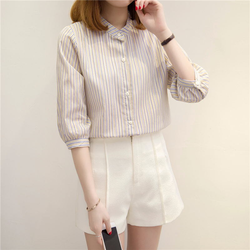/ 夏裝新款女裝條紋襯衫女小清新上衣半袖韓范寬松bf風襯衣女夏