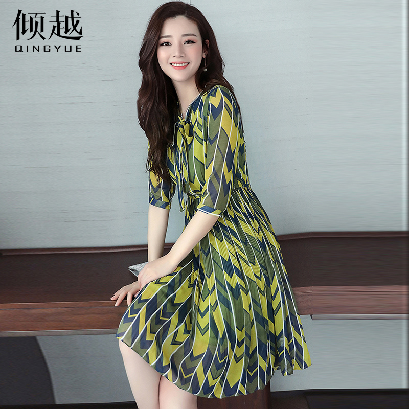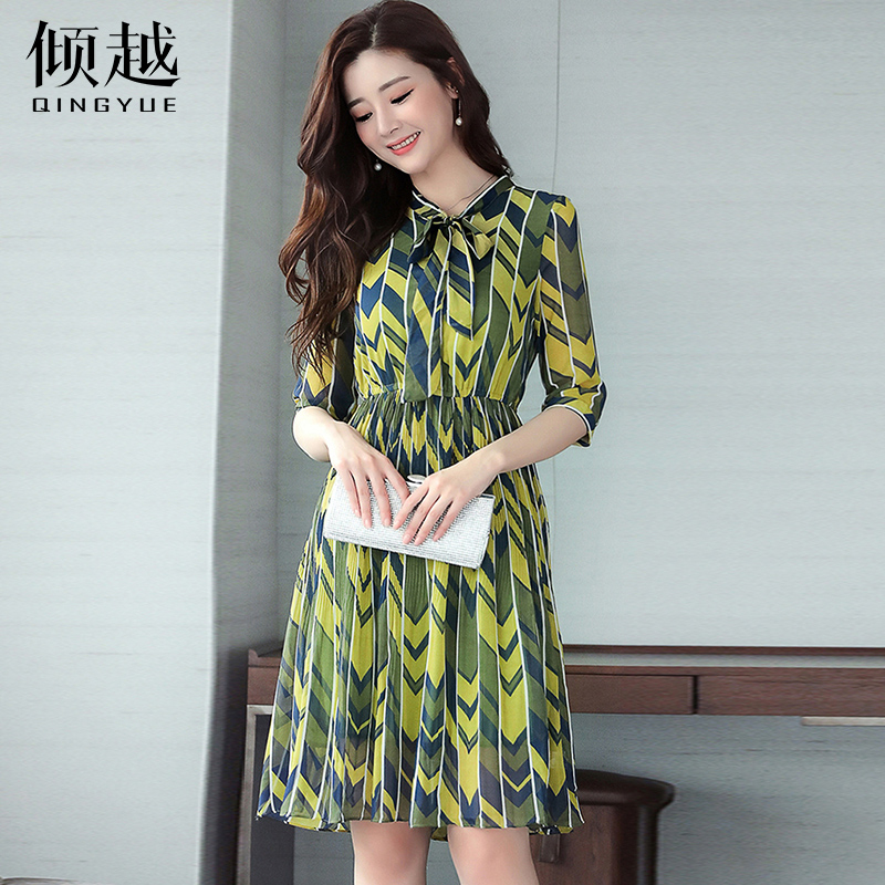 / 傾越夏季連衣裙2017夏裝新款韓版顯瘦氣質蝴蝶結中長款雪紡裙子女