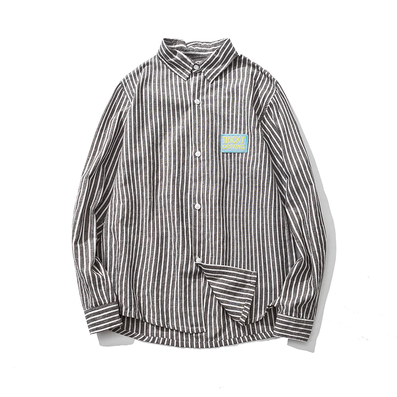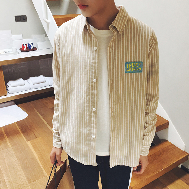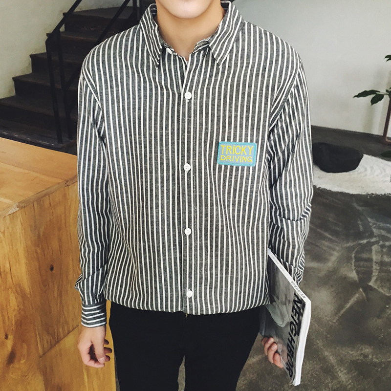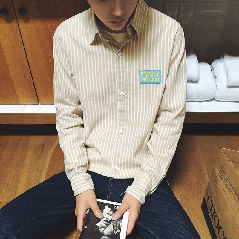 原創青少年長袖男士襯衫英文刺繡條紋潮男襯衣