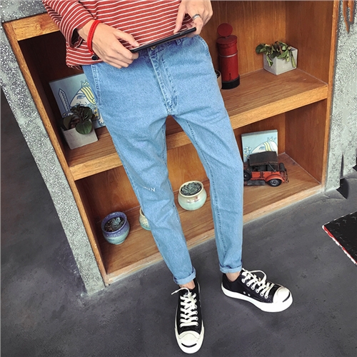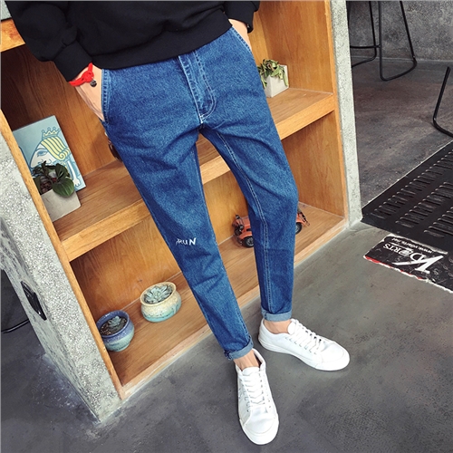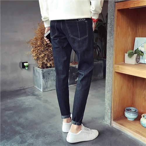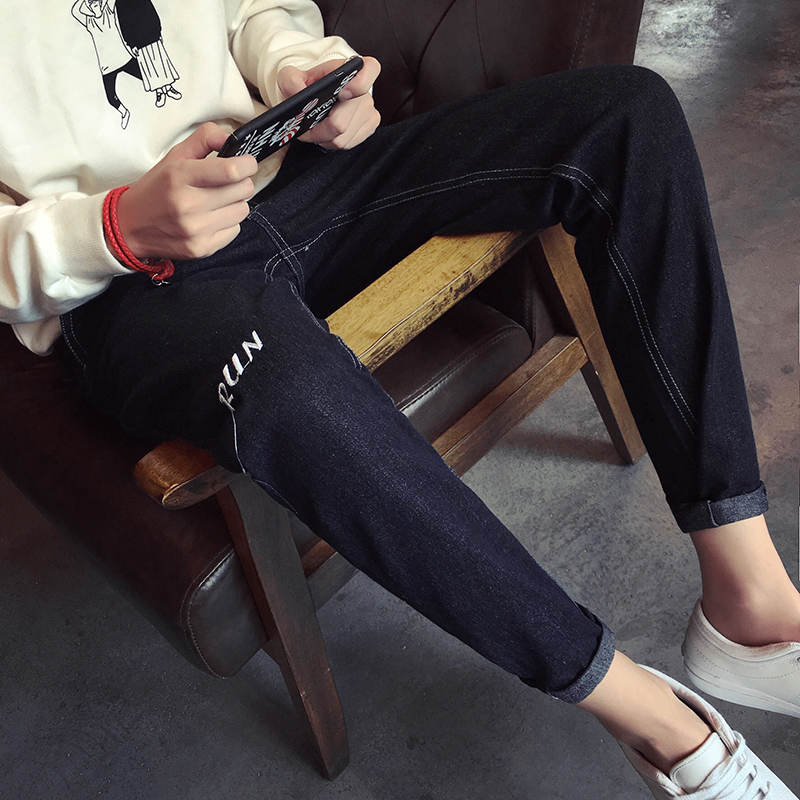 / 秋季新款英文刺繡青年韓版修身小腳男士長褲牛仔褲