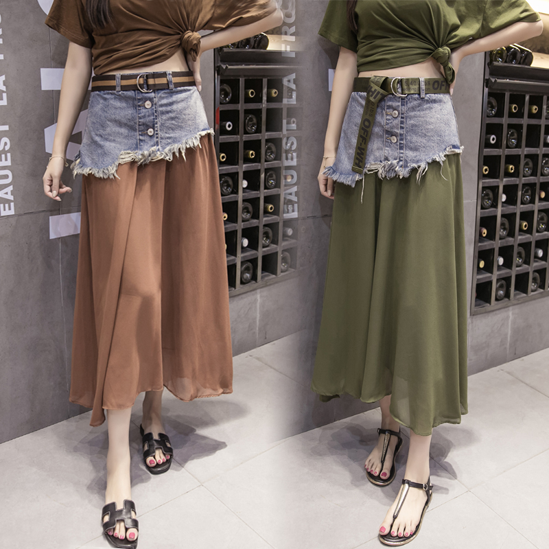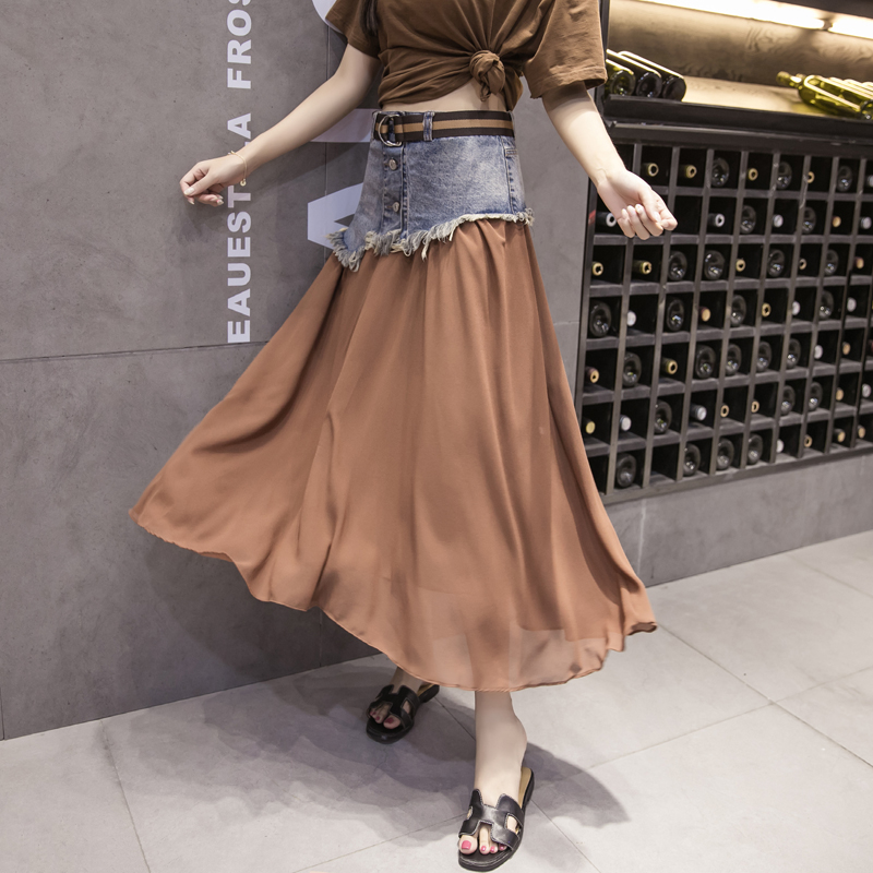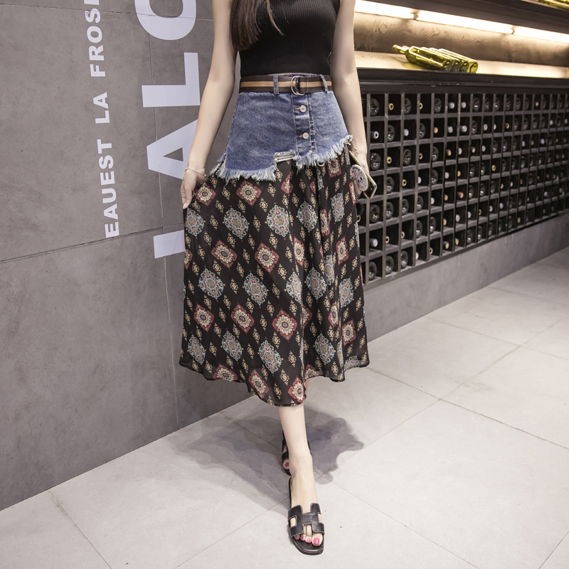 / 韓版高腰牛仔拼接半身裙女中長款A字裙雪紡沙灘裙碎花長裙半裙夏