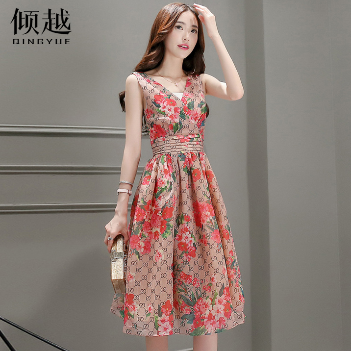 傾越2017夏無袖雪紡連衣裙修身裙子碎花背心裙波西米亞長裙沙灘裙
