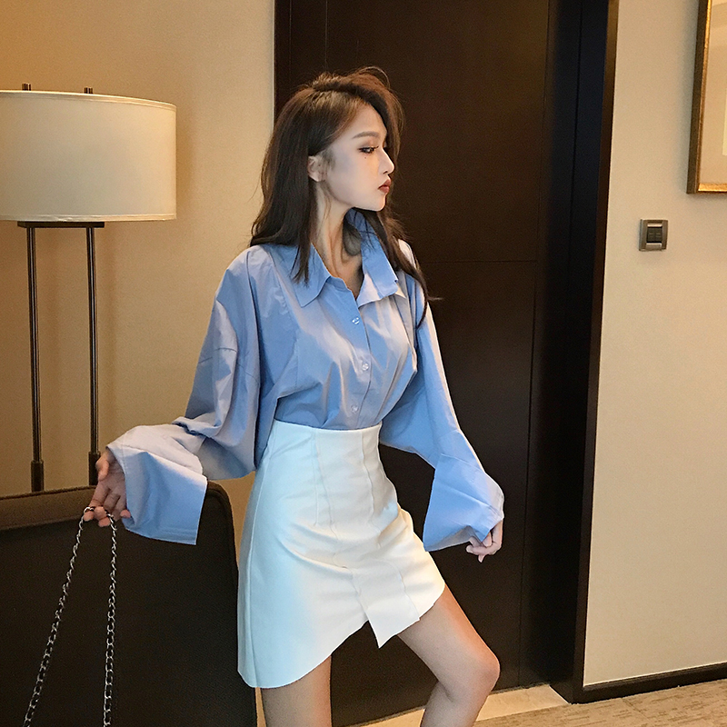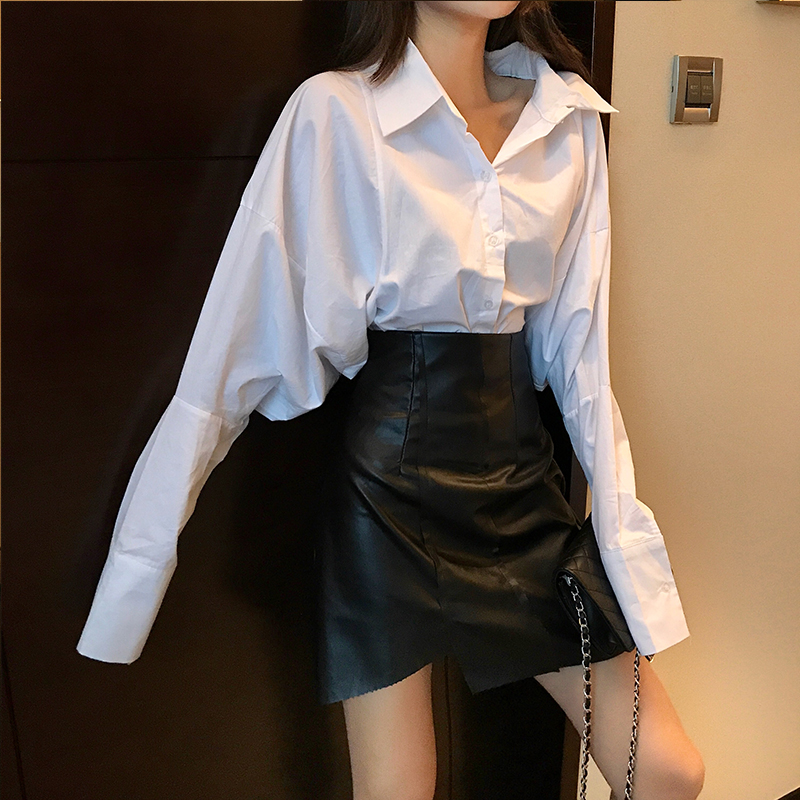 / 小清新減齡簡約純色氣質襯衣女+不規則百搭半身皮裙時尚套裝秋潮