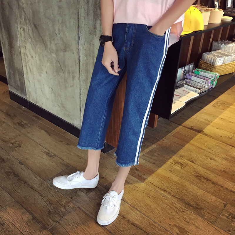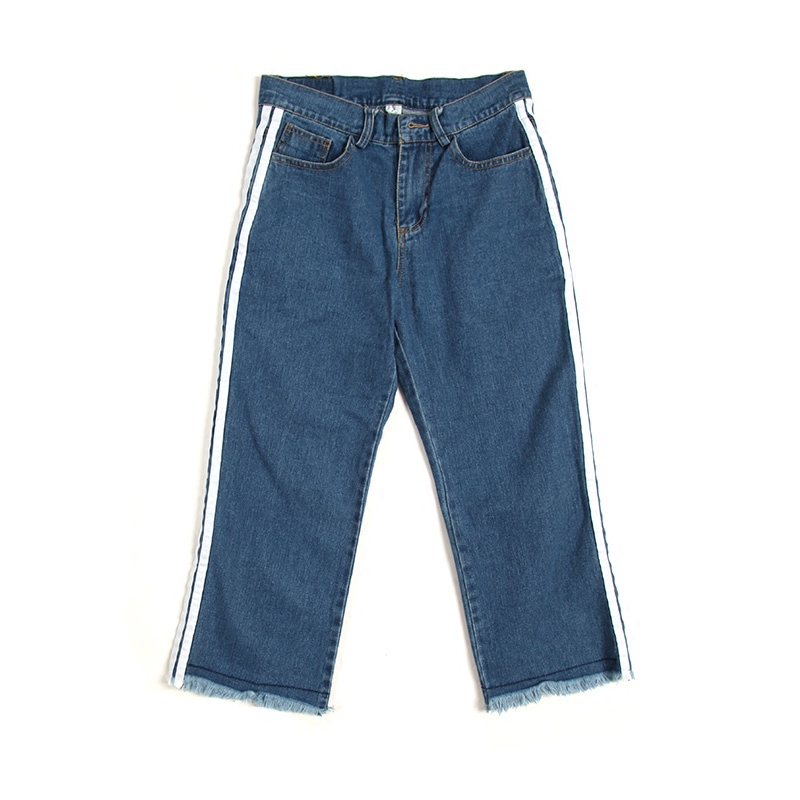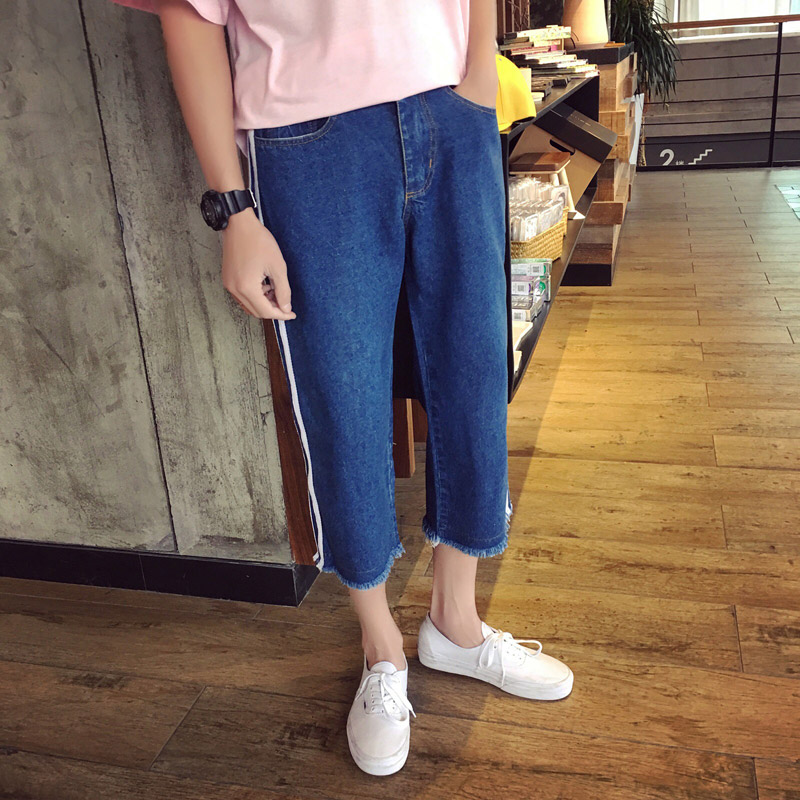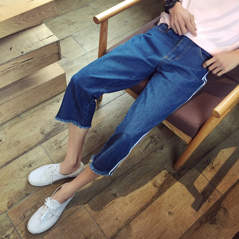 / 秋裝雙杠拼接韓版直筒寬松闊腿男士牛仔八分褲