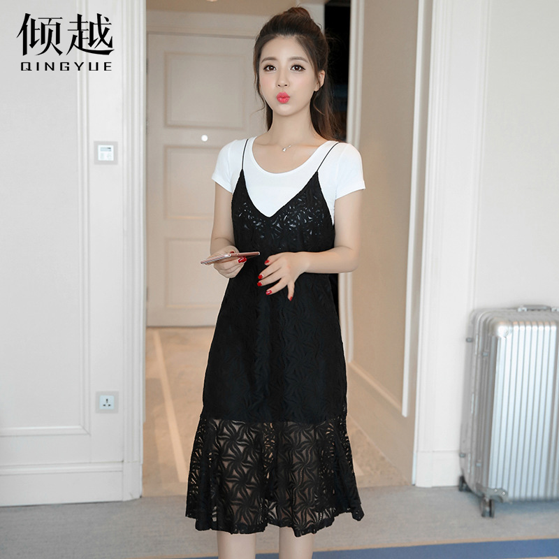 傾越2017夏韓版吊帶鏤空蕾絲連衣裙兩件套女中長款套裝裙子魚尾裙