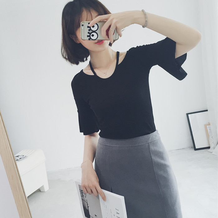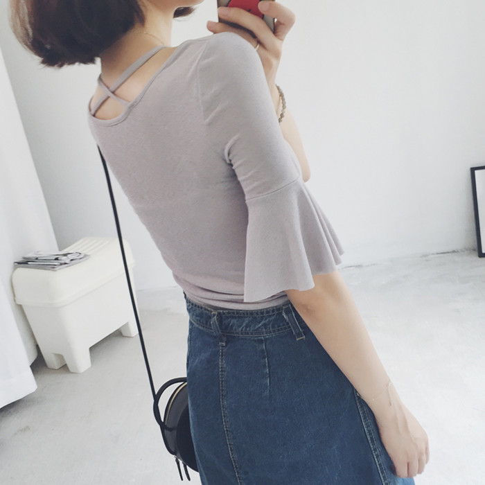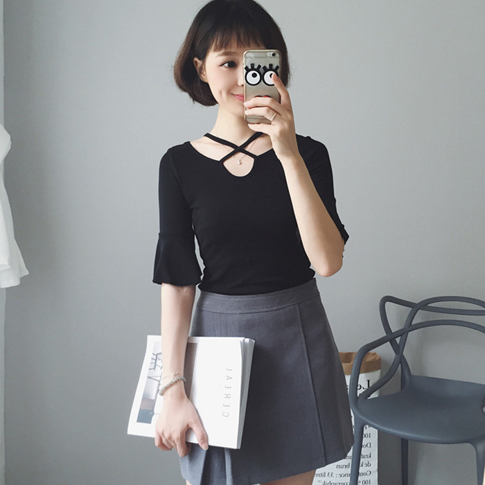 / 夏季韓版新款純色百搭修身顯瘦喇叭袖低領性感上衣短袖T恤女