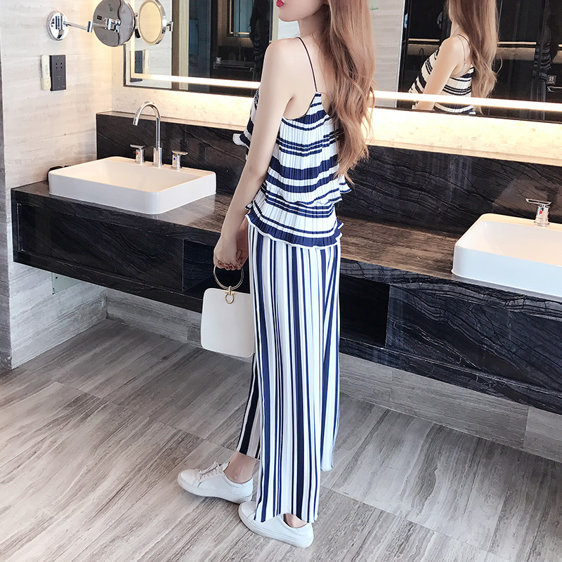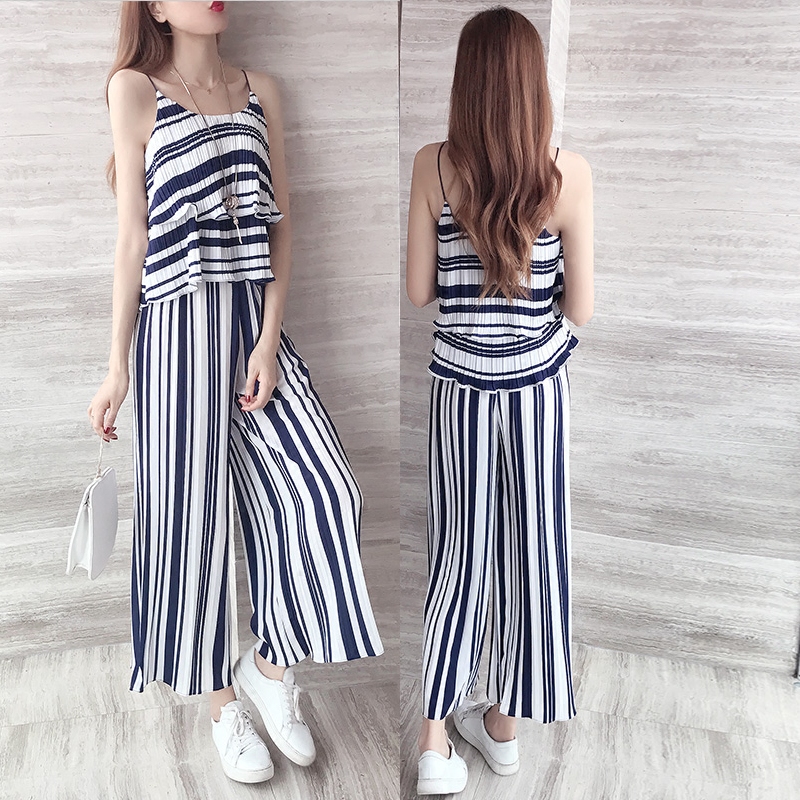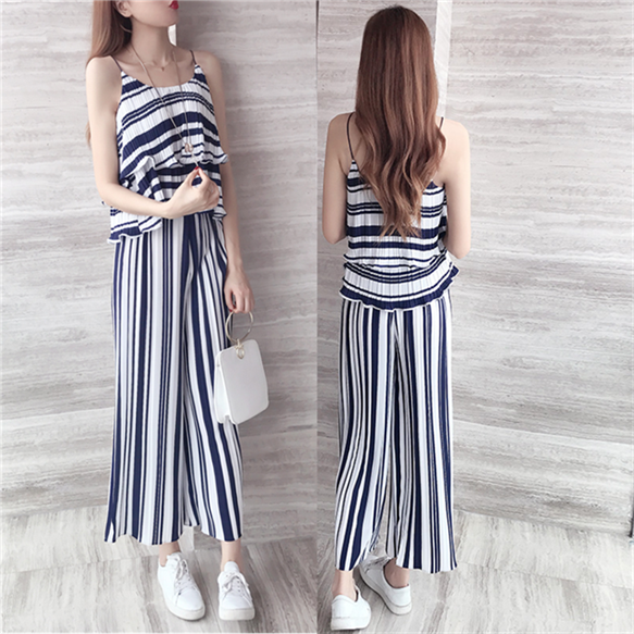 / 新款夏季兩件套時尚小清新甜美學生條紋吊帶背心闊腿褲套裝女