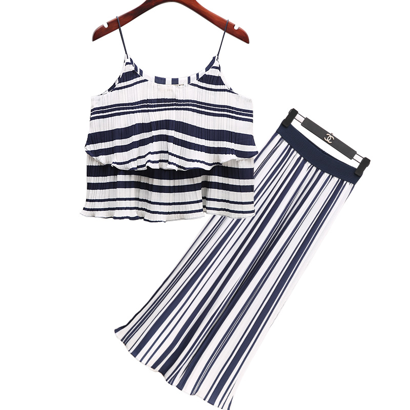 新款夏季兩件套時尚小清新甜美學生條紋吊帶背心闊腿褲套裝女