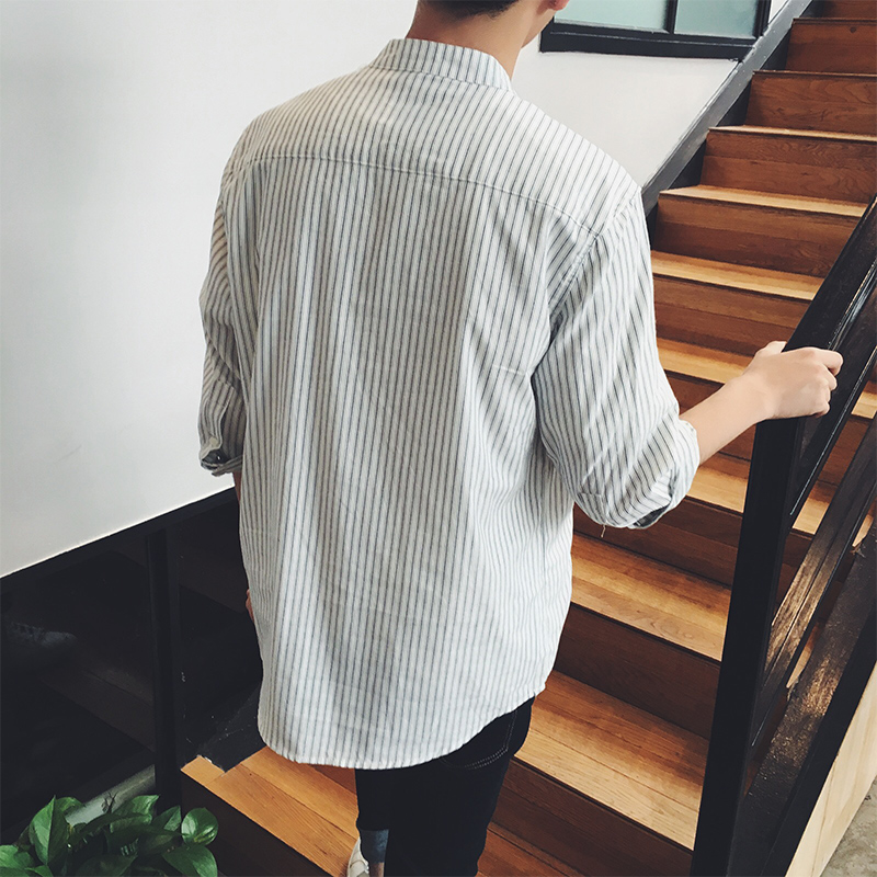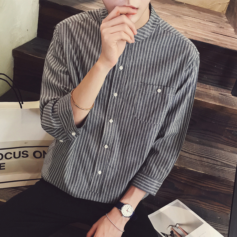 / 原創小清新豎條紋襯衫韓版男士立領七分袖襯衣