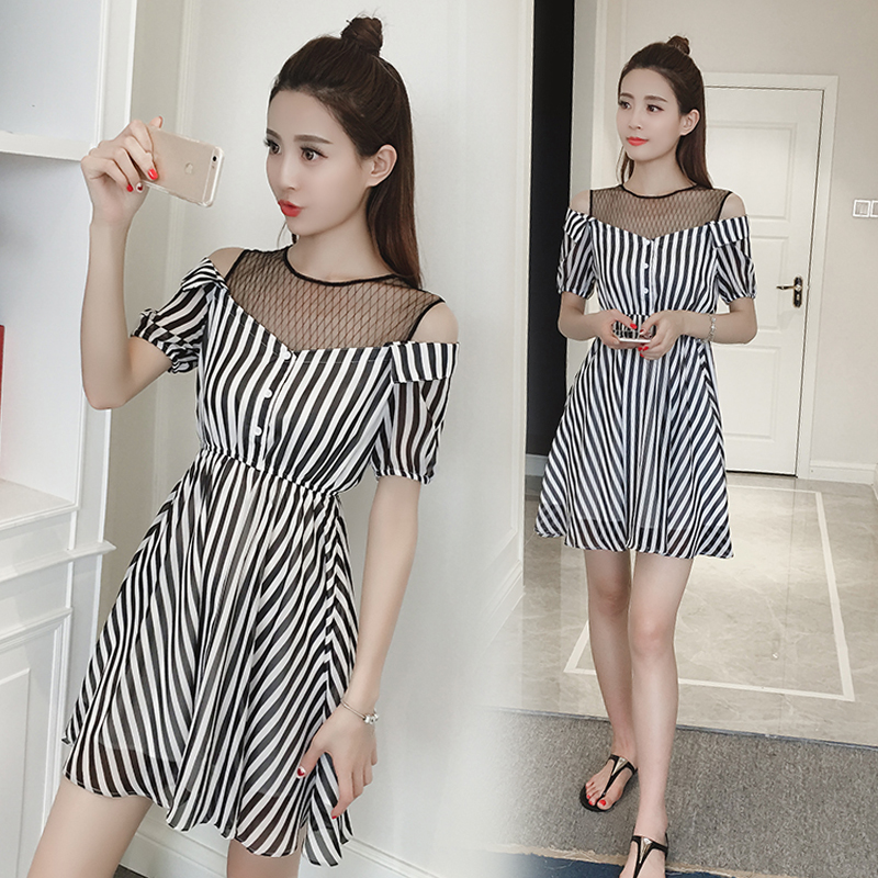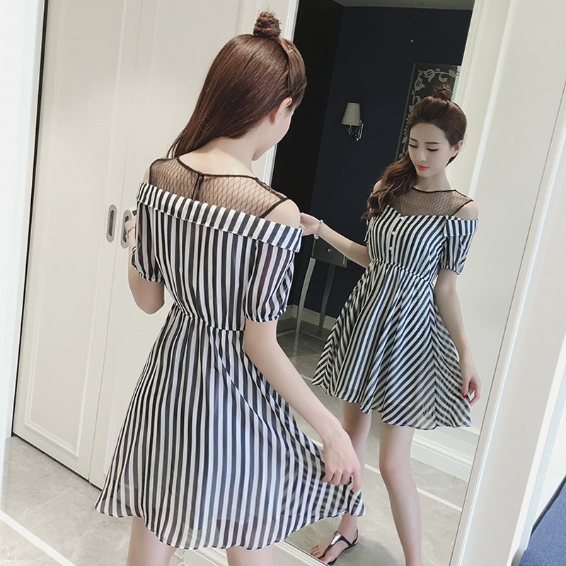 / 夏季新款女裝韓版網紗拼接露肩裙子中長款收腰條紋短袖連衣裙