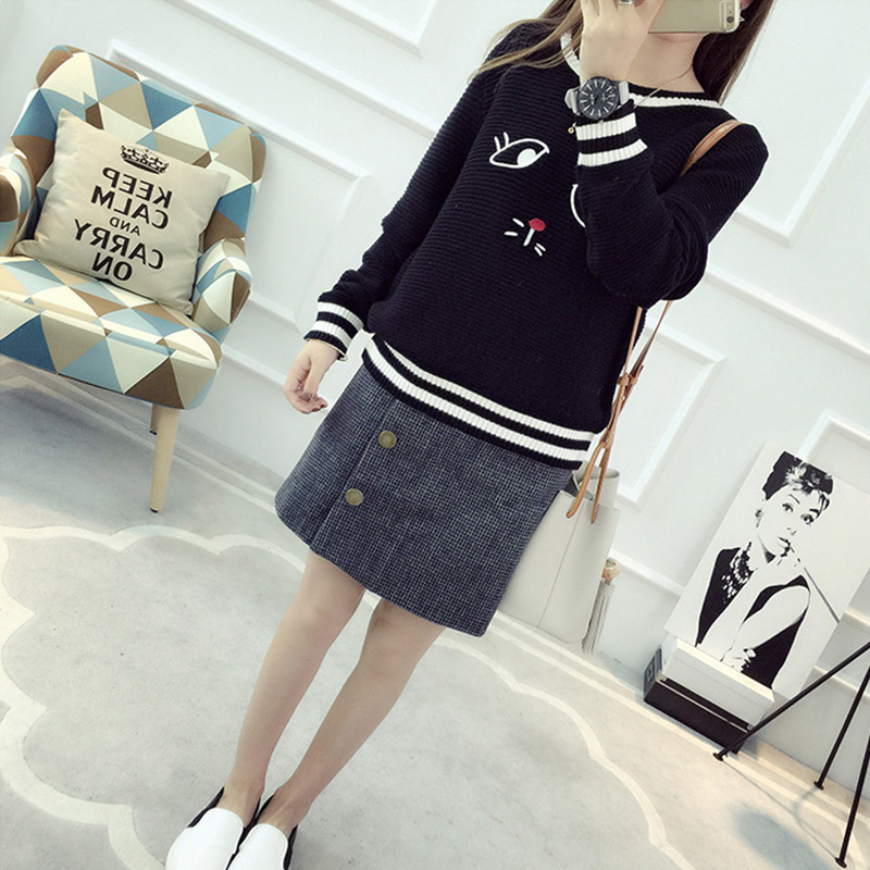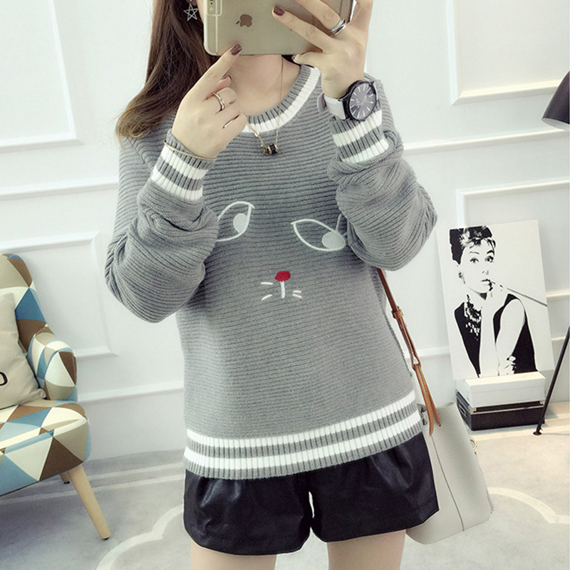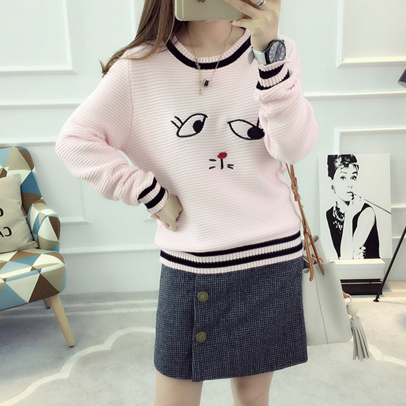 套頭毛衣女學生韓版短款圓領長袖針織衫春裝新款女裝刺繡上衣
