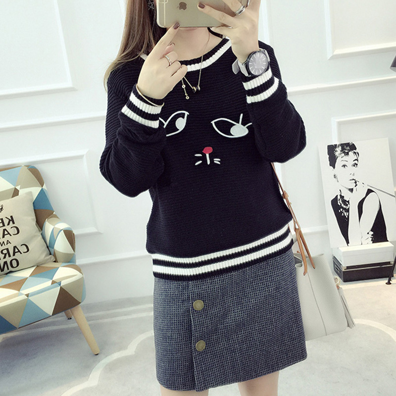 / 套頭毛衣女學生韓版短款圓領長袖針織衫春裝新款女裝刺繡上衣