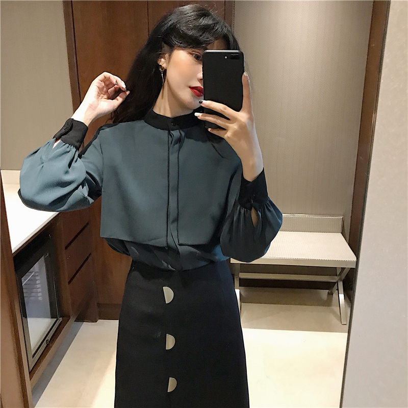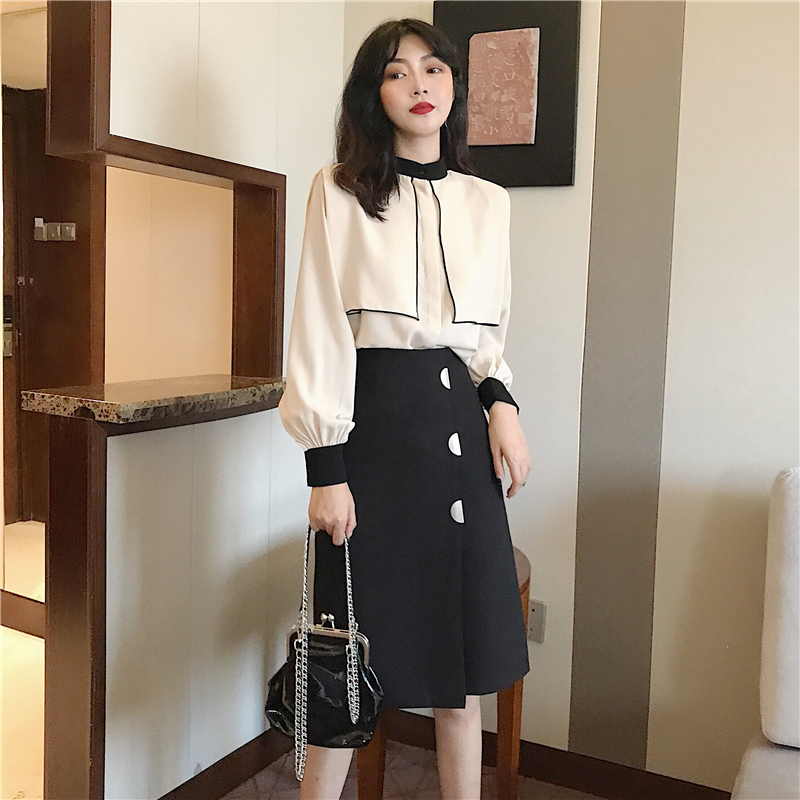 / 新款立領撞色披肩長袖襯衣時尚套裝半圓金屬扣百搭半身裙兩件套女