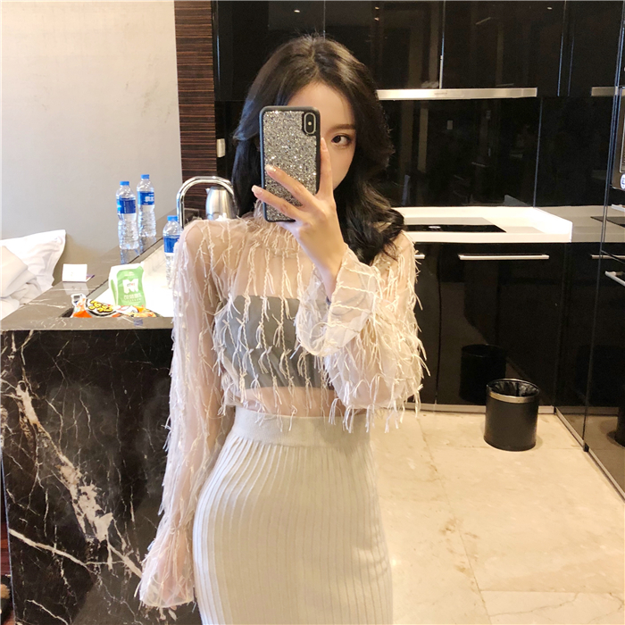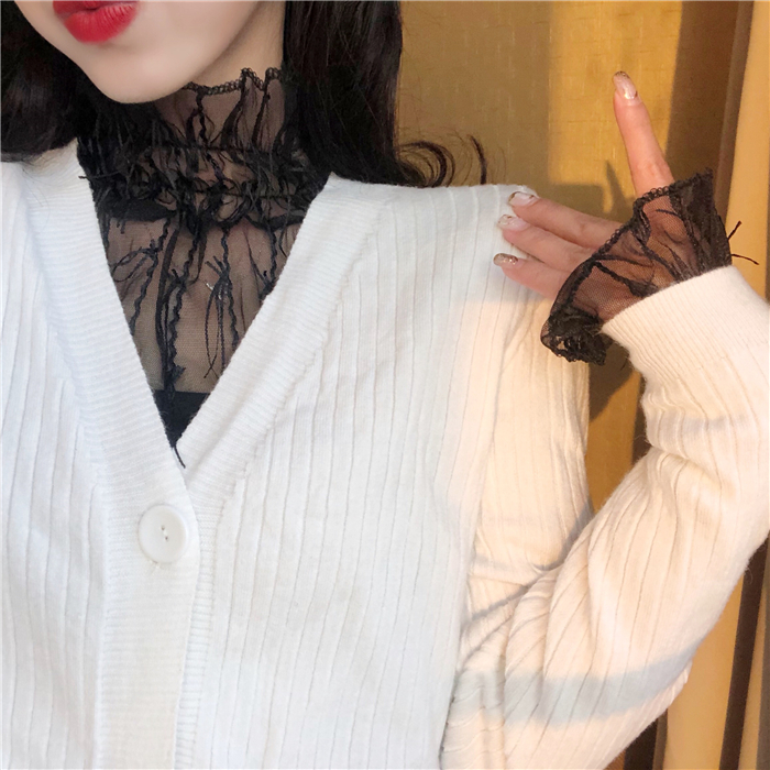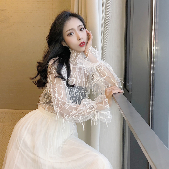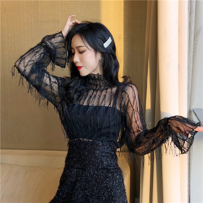 / 蕾絲打底女長袖2018新款百搭性感高領設計感時尚透視流蘇網紗上衣
