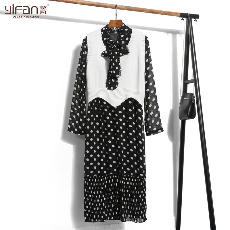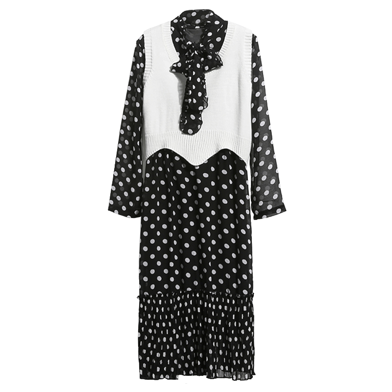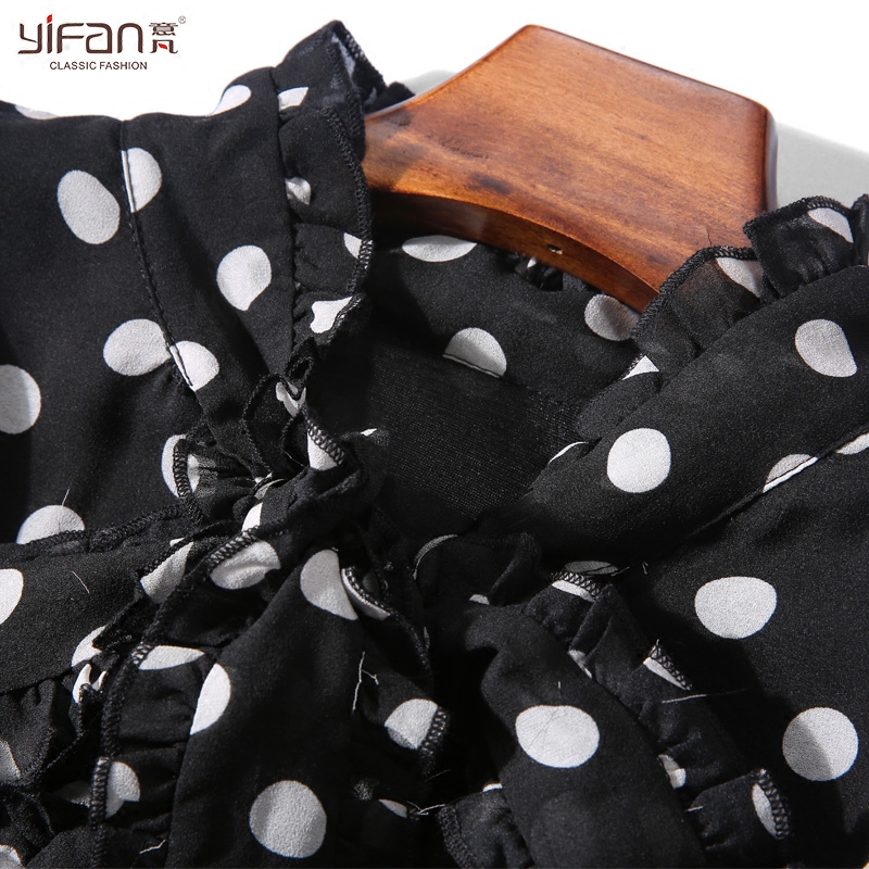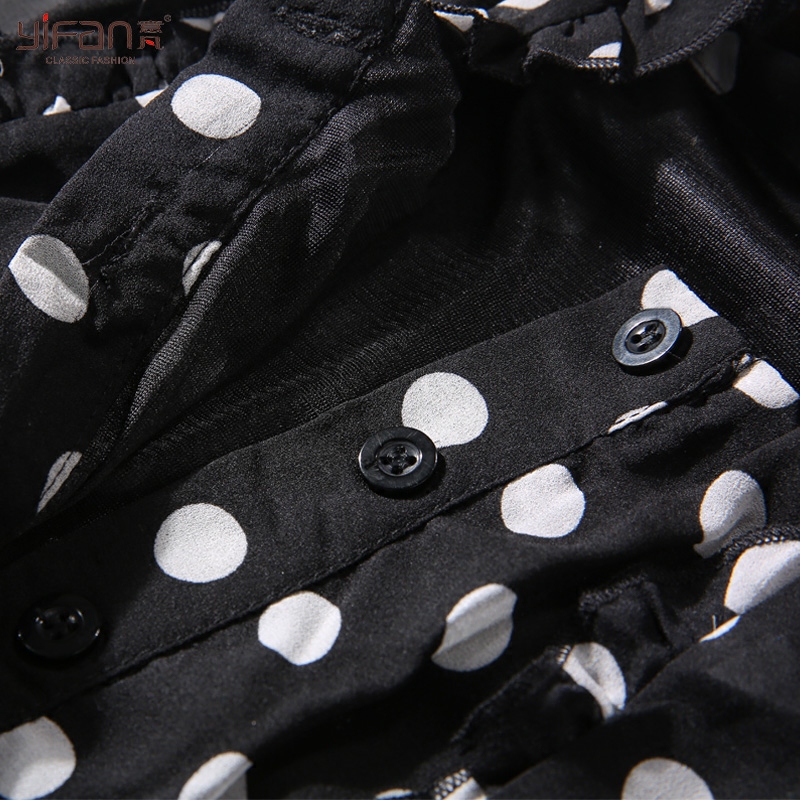 / 春夏雪紡波點長袖連衣裙韓版新款蝴蝶結領打底寬松沙灘裙