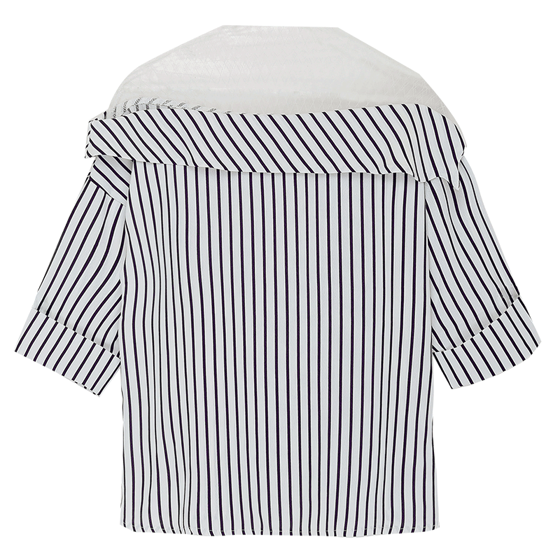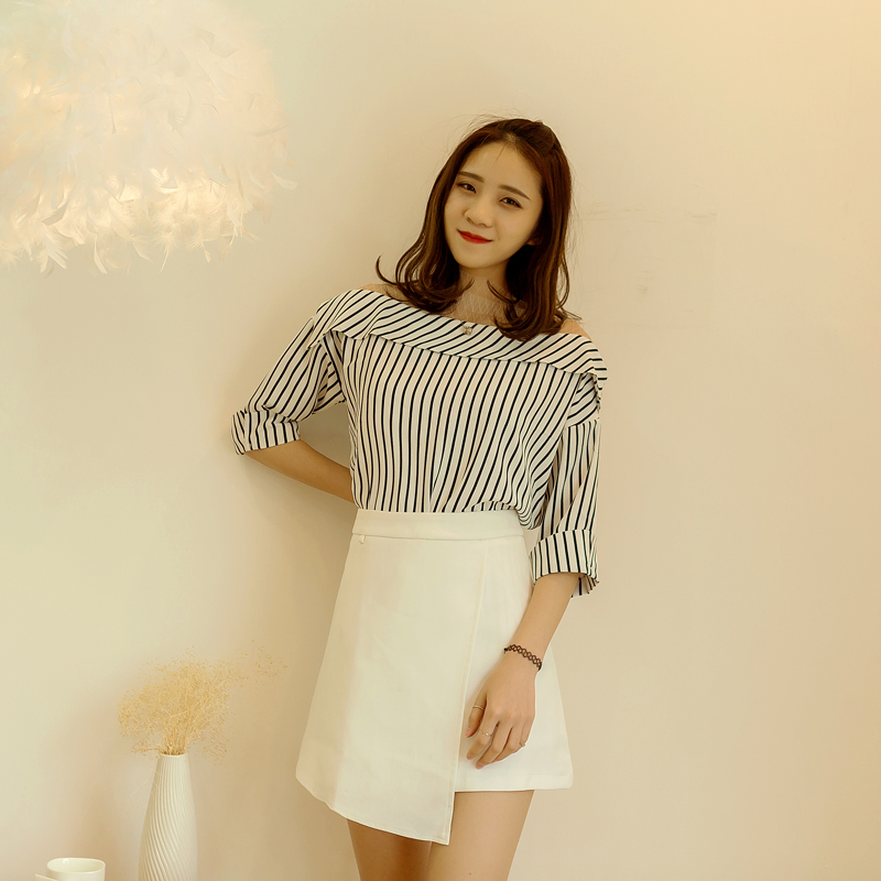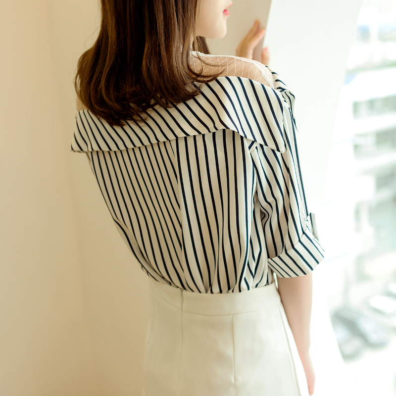 / 襯衫女夏裝新款韓版蕾絲拼接條紋漏肩一字領學生襯衣上衣潮