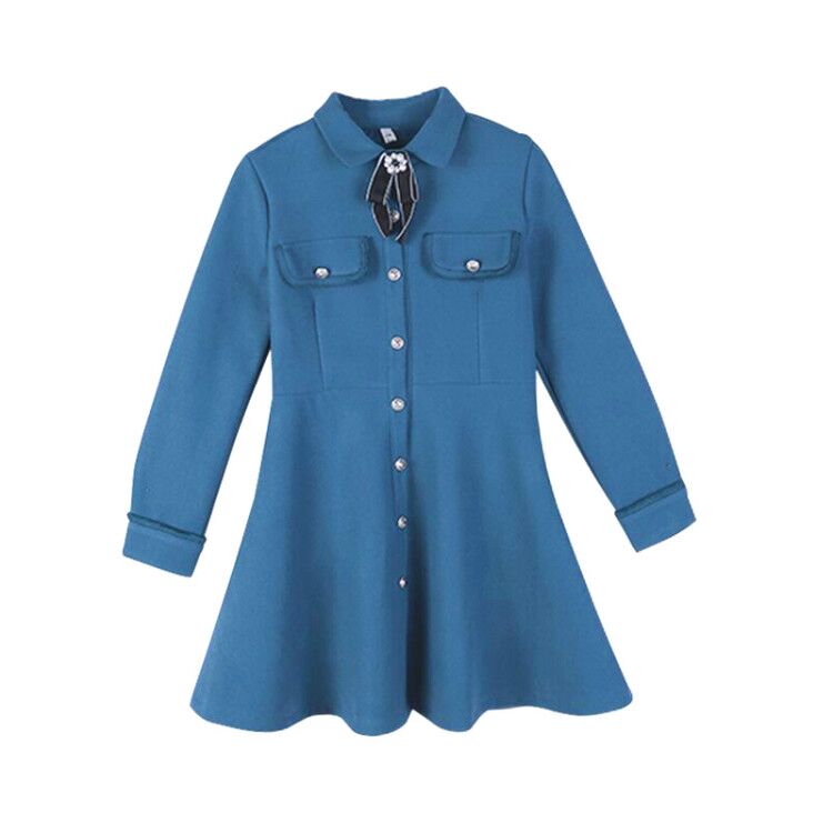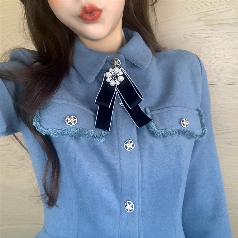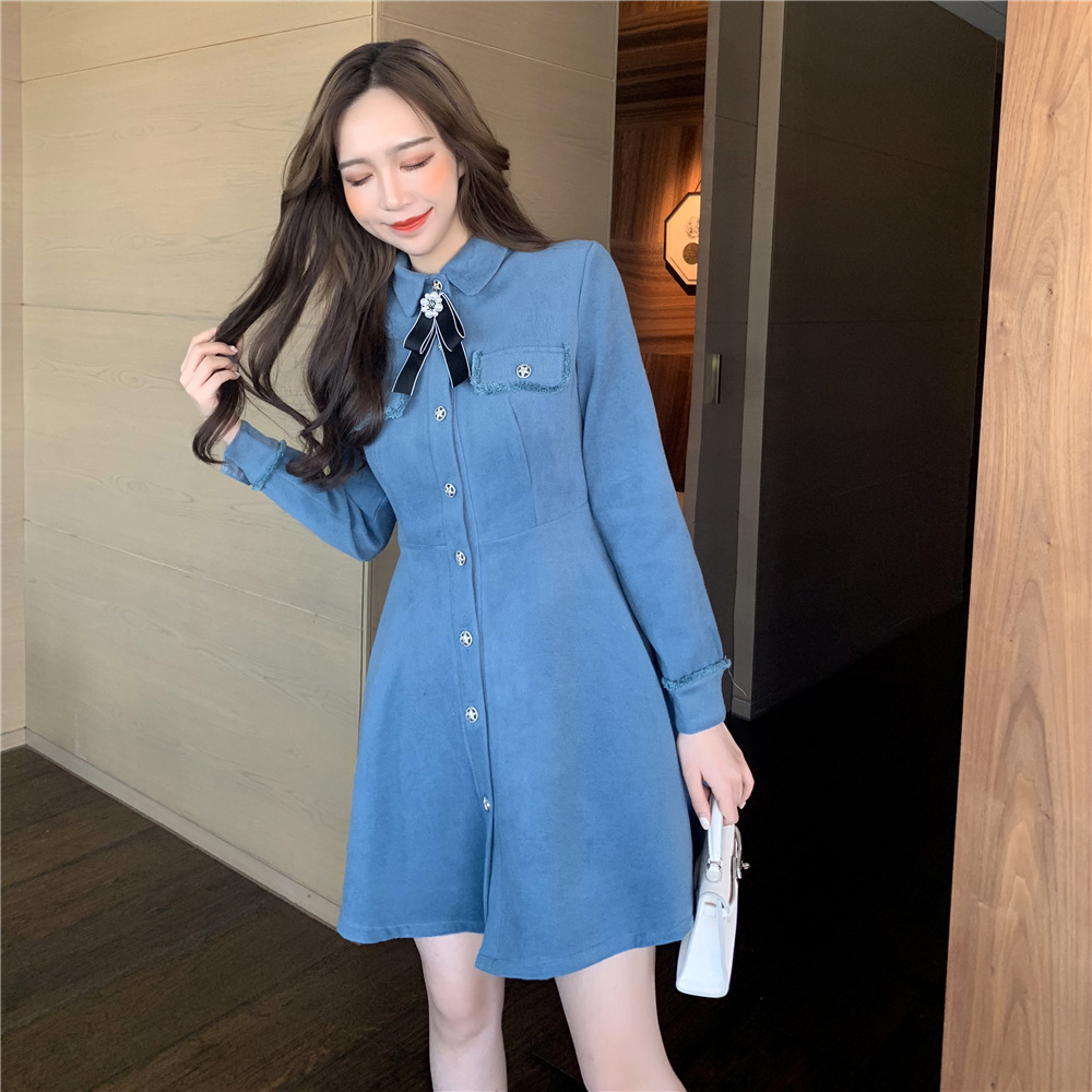 / 小香風新款韓版百搭復古氣質溫柔收腰A字襯衣領毛呢長袖連衣裙女