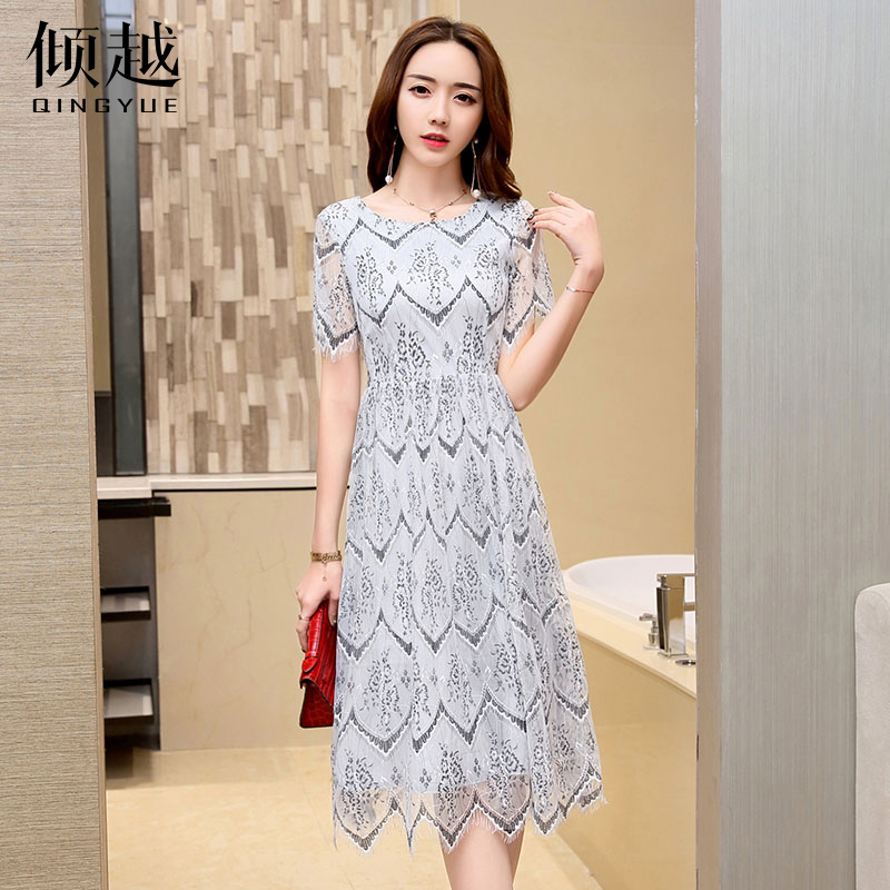 / 傾越2017春裝新款雪紡連衣裙蕾絲鉤花鏤空a字裙五分袖條紋中長裙